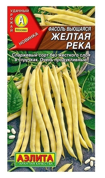 Красивый и очень продуктивный, среднеранний, спаржевый сорт. Урожай созревает через 55-65 дней после появления всходов. Растения вьющиеся, мощные, нуж даются в опоре. Створки бобов золотисто-желтые, не содержат жесткого пергаментного слоя. Семена светло-бежевые, крупные, плотно заполняют стручки. В кулинарии используются молодые бобы целиком и спелые семена. Сорт подходит для консервирования и замораживания.