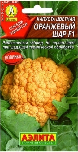 Новый, по настоящему «цветной» гибрид цветной капусты. Необычная окраска результатом генной инженерии не является и не имеет ничего общего с пресловутым «гмо». Это экологически чистый продукт, созданный методами традиционной селекции. Гибрид раннеспелый, формирует товарную головку массой около 500 г примерно через 70-75 дней от высадки рассады. Красивая оранжевая головка по вкусу не отличается от белоцветной. Но расширяет границы кухонной (и огородной) эстетики и содержит на порядок больше каротина, полезного для зрения и кожи. Продукция не теряет цвет при щадящей термической обработке. Гибрид подходит для производства мини-овощей.