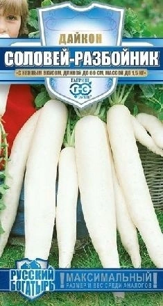 Среднеспелый (от всходов до уборки урожая 45-57 дней) сорт крупного дайкона для летнего посева. Цилиндрические белоснежные корнеплоды длиной до 60 см и диаметром 10-12 см, к сбору урожая достигают массы 1,2-1,5 кг. Мякоть плотная, хрустящая, очень сочная, нежная, не содержит острых горчичных масел. Сорт жаростойкий, устойчив к болезням. Используют в свежем виде и для непродолжительного хранения. Корнеплоды на 2/3 приподняты над поверхностью почвы, что облегчает ручную уборку. Урожайность 11-15 кг/м?. Посев производят в открытый грунт, в июле, на глубину 1,5-2 см. Всходы появляются на 3-5 день. Уборку корнеплодов осуществляют во второй половине сентября или в октябре.