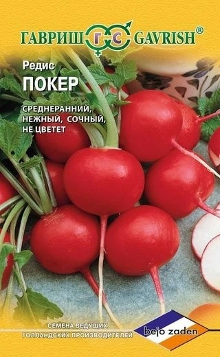 Среднеранний (28 дней от всходов до технической спелости) сорт для открытого грунта. Розетка листьев прямостоячая. Корнеплод округлой формы, ярко-красный, массой 20 г. Мякоть белая, сочная, нежная, долго не дрябнет. Вкус отличный. Сорт устойчив к цветушности. Урожайность 2,3 кг/кв.м. Посев в грунт производится в конце апреля – начале мая на глубину 1 см по схеме 5-7x15 см. Редис предпочитает легкие, структурированные, хорошо удобренные почвы.