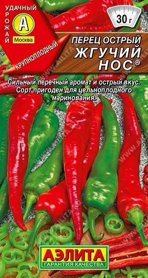 Крупноплодный сорт для открытого грунта и пленочных укрытий. Среднеспелый, от всходов до первого сбора плодов 100 дней. Растения полураскидистые, высотой 70-80 см. Плоды длиной 10-12 см, массой 30 г. Толщина стенки 3,5-4 мм. Вкус острый. Аромат сильный. Рекомендуется для цельноплодного маринования. Используется также в составе пряных смесей при консервировании овощей и для изготовления специй. Урожайность 3,5-4 кг/м2.