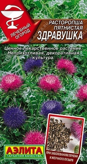 Лекарственное, эфиро-масличное, двулетнее растение высотой 1-1,5 м. В средней полосе выращивается как однолетняя культура. В медицинских целях используются все части растения. Семена собирают с августа по октябрь, заготовку корней и листьев проводят осенью, после сбора семян. Расторопша содержит силимарин, редко встречающийся в природе и являющийся средством для профилактики и лечения заболеваний печени и желчного пузыря. Сорт отлично подходит для приготовления целебного фиточая. Очень декоративен в саду. Дает самосев.