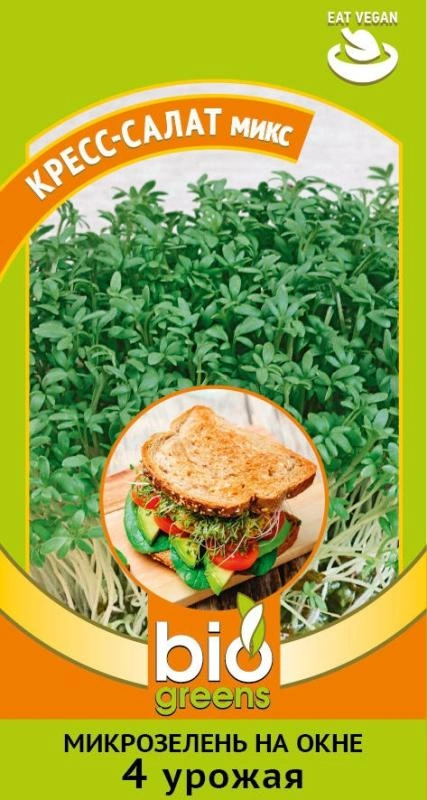 Зеленые ростки с нежно-пряным вкусом. Богаты витаминами группы В, Е, К, PP, D, С, фосфором, магнием, кальцием, белками и флавоноидами. Употребление микрозелени кресс-салата оказывает положительное действие на самочувствие и активность, особенно в осенне-зимний период, способствует улучшению зрения. Кроме того, она очень вкусна и добавит пикантности салату, гарниру или сэндвичу. В состав входят следующие сорта: Дукат, Весенний, Витаминчик.