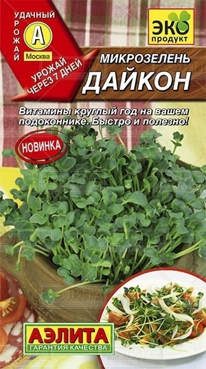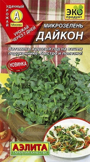 Свежая зелень по вкусу похожа на редис, с пикантным послевкусием редьки. Её употребление укрепляет иммунитет, улучшает пищеварение, оказывает успокаивающее действие на нервную систему. Она незаменима в диетическом питании. В пищу используют стебли и листья молодых растений. Благодаря эфирным маслам, микрозелень Дайкон создает яркие вкусовые оттенки в овощных салатах и мясных блюдах. Состав: семена дайкона Целитель.