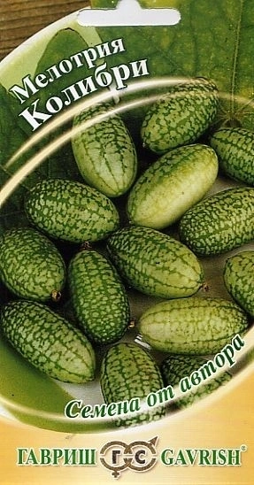 Колибри - новый сорт, рекомендуется для выращивания на приусадебных участках. Мелотрия - малораспространенная овощная культура семейства тыквенных, родом из Африки. Это своеобразный миниатюрный огурец - небольшие плодики (1,5-2,5 см) светло-зеленого цвета по вкусу напоминают огурец, а плотная кожица имеет приятный кисловатый привкус. Прекрасно подходит для засолки, маринования, по вкусу напоминает пикули. Мелотрия - однолетнее травянистое растение, которое формирует побеги длиной до 3 м. Листья треугольной формы, остороконечные, опушенные. Растения имеют ярко-желтые воронковидные раздельнополые цветки: женские расположены на растениях одиночно, мужские собраны в узлах по нескольку штук. Мелотрию используют в озеленении, растения хорошо ветвятся, быстро разрастаются, легко крепятся усиками к всевозможным опорам, полностью оплетая их. Очень неприхотлива, любит рыхлые, хорошо увлажненные почвы. Уход заключается в своеременных прополках, поливах, рыхлениях, подкормках.
