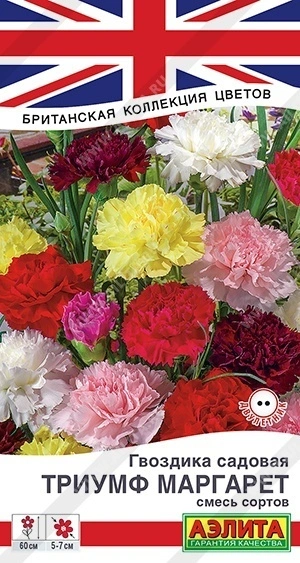 Смесь крупноцветковой гвоздики, потрясающая своей эффектностью и множеством оттенков. Очень красива в срезке. Кустики крепкие, ветвистые, высотой до 60 см, рано и пышно цветут. Соцветия махровые, Ø 5-7 см, надолго сохраняют глубину цвета и свежесть. Своевременное удаление завядших цветков стимулирует образование новых бутонов. Смесь используется при оформлении высокорослых цветников, бордюров, крупных вазонов. При рассадном способе выращивания добиться цветения можно уже на первый год, при пря мом посеве в грунт – на второй год, при этом рекомендуется легкое укрытие на зиму.