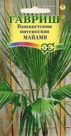 Красивая многолетняя пальма достигающая в природе 20 м. Растение неприхотливое, очень интересное для комнатного цветоводства. Вашингтония нитеносная отличается от вашингтонии робусты относительно невысоким, но толстым стволом, и более рыхлой кроной. Она предпочитает расти в сухих местах и чуть более устойчива к холоду. Эффекные зеленые веерные листья (до 2 м) на развитых черешках состоят из многочисленных листовых сегментов, между которыми свисают тонкие кудрявые нити. В природных условиях засохшие листья отгибаются книзу и висят на дереве, образуя вокруг ствола широкую "юбку" . В домашних условиях увядающие листья удаляют вместе с большей частью черешка, остатки черешков одревесневают и образуют мощный ствол. Цветет весной длинными кистями с ароматными желтыми или белыми цветами. С конце лета созревают красно-черные плоды с овальными семенами. Размножается семенами. Семена замачивают на двое суток в теплой воде, затем высаживают в рыхлый субстрат из дерновой, листовой земли и песка (2:2:1).