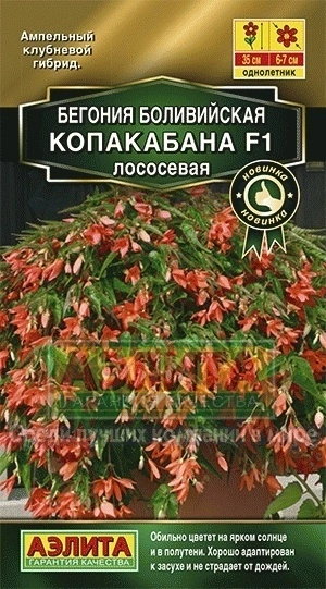 Эксклюзивный гибрид с ампельным габитусом. Необычайно пластичный к интенсивности освещения – в отличие от других клубневых бегоний, отлично цветет на ярком солнце. Листья при этом выглядят немного бледнее, чем в затенении, но их практически не видно за лавиной лососевых цветков Ø 6-7 см. До высоты 35 см растения имеют прямостоячую форму, далее начинают интенсивно куститься и образуют пышные каскады в вазонах или приобретают стелющуюся форму на клумбах. Гибрид хорошо адаптирован к засухе и не страдает от дождей. Зацветает через 14-15 недель от всходов.