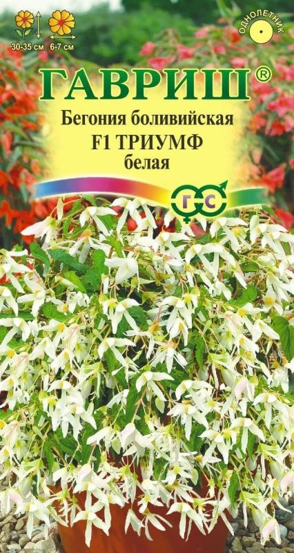 Бегония боливийская серии «F1 Копакабана» - выносливое и неприхотливое стелющееся однолетнее растение, усыпанное множеством белых цветков колоколообразной формы диаметром 6-7 см. Побеги сначала растут вверх, а по достижении высоты 30-35 см элегантно ниспадают вниз в виде многоярусного цветочного каскада. Очень хорошо переносит яркое солнце, дождь, засуху, затенение. Идеальна для больших подвесных корзин, вазонов и ящиков на возвышенных местах, а также посадки в цветники и клумбы. Семена высевают в конце февраля-начале марта, не заделывая, в неглубокие ящики с просеянной смесью листовой земли, торфа и песка (2:1:1). Посевы содержат под стеклом и до первой пикировки равномерно увлажняют теплой водой с поддона. Пикируют в стадии 2-3 настоящих листочков. Для цветения растений в мае требуется посев в январе. Вегетационный период длится 14-17 недель. Молодые растения высаживают на расстоянии 20-30 см друг от друга. Цветет с мая по октябрь. После цветения надземная часть отмирает и через 2 недели клубни вынимают.