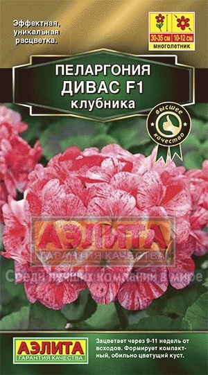 Гибриды ДИВАС F1 – прорыв в селекции зональной пеларгонии. Эффектные цветки в сочных «брызгах», обильное продолжительное цветение, безусловно, обеспечат новинке статус хита продаж. Уникальная расцветка гибридов достойна того, чтобы любоваться ими на собственном подоконнике или в цветнике, а не на картинке. Гибриды формируют компактные аккуратные кусты 30-35 см высотой и 25 см в диаметре, с крупными шаровидными соцветиями 10-12 см. Растут из семян быстро, зацветают через 9-11 недель от полных всходов. Неприхотливы в уходе, одинаково успешно украшают садовые цветники, комнаты и балконы.