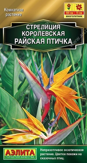 Многолетнее вечнозеленое растение, высотой до 1,5 м, с большими овальными кожистыми темно-зелеными листьями длиной до 40-45 см. Длинный цветонос образуют чешуевидные листья, под самым крупным последним листом он изогнут так, что напоминает голову экзотической птицы. Чешуевидный сероватый лист раскрывается наверху щелью, через которую один за другим выходят наружу крупные (до 15 см) цветки с оранжевыми и лиловыми лепестками, создавая иллюзию хохолка птицы. Цветки открываются в течение нескольких недель: на смену увядшим приходят все новые и новые. Перед посевом рекомендуется очистить семена от оранжевых волосяных хохолков и сделать небольшой надпил, ошпарить мыльным раствором и высадить семена в грунт на глубину в 1,5 раза превышающую размер семени. При проращивании поддерживать постоянную температуру на уровне 25 градусов, при которой всходы появляются в течение 4-8 недель (более низкая температура задерживает прорастание). Первую пересадку в хорошо дренированный грунт производят в фазе 2-3 листьев.