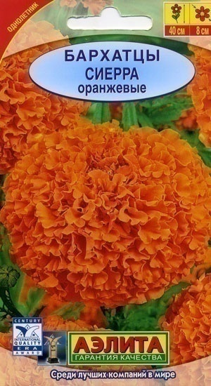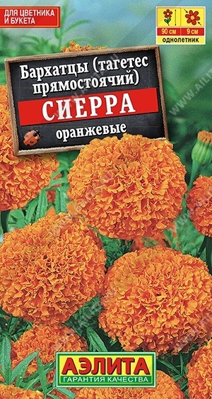 Высокорослые, обильноцветущие бархатцы. Серия Сиерра формирует очень выравненные по габитусу растения, которые прекрасно держат форму в течение всего сезона. Кусты крепкие, хорошо разветвленные, высотой 70-90 см. Соцветия густомахровые, крупные, Ø 7-9 см, на прочных стеблях. Цветение раннее, продолжительное и очень яркое. Растения используют для оформления среднего яруса сборных цветников и высоких бордюров. Серия ценится за срезку высокого качества.