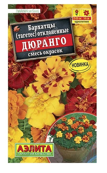 Необыкновенная смесь бархатцев серии Дюранго американской селекции – это смелый микс непревзойденных оттенков! Цветки анемоновидного типа диаметром 5-6 см. Цветение раннее, обильное и продолжительное. Кустики густоветвистые, пушистые, высотой 25-30 cм, шириной не более 15-20 см. Серия создана для садовых вазонов и балконных контейнеров. Станет выигрышным конкурентом среди прочих бордюрных культур. Разнообразит смешанные цветочные композиции или выступит универсальной монокультурой.