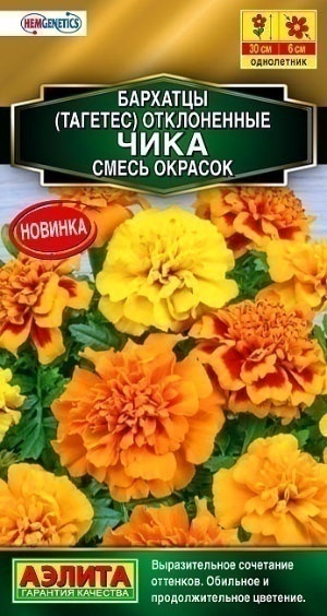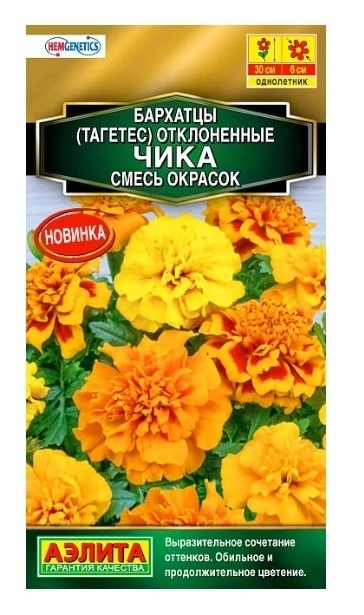 Нарядная раннецветущая смесь компактных бархатцев станет настоящим украшением вашего сада. Несмотря на компактность куста, растение поднимает к солнцу многочисленные махровые соцветия Ø 5-6 см. Кустики хорошо ветвятся, выравнены по габитусу, в открытом грунте достигают 25-30 см в высоту, в горшечной культуре не превышают 15-20 см. Использование бархатцев многообразно: из них получаются пышные бордюры, для создания ярких акцентов их включают в клумбы и миксбордеры. Благодаря своей неприхотливости, замечательно растут в вазонах, контейнерах, балконных ящиках.