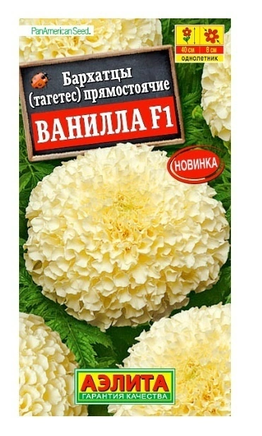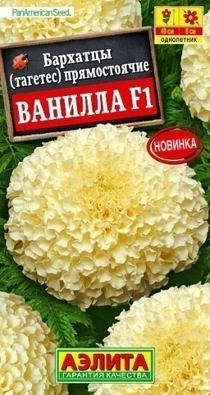 Потрясающий однолетник с крупными цветками настоящего кремового оттенка. Гибрид формирует прямостоячий куст высотой до 40 см и шириной до 25 см. Цветы крупные, густомахровые, диаметром 6-8 см. Листья насыщенного темно-зеленого цвета. Растение неприхотливое и при правильном уходе порадует цветением до самых заморозков. Бархатцы используют для создания пышных бордюров, рабаток, прекрасно подходят для балконных контейнеров и горшков. Дают отличную срезку.