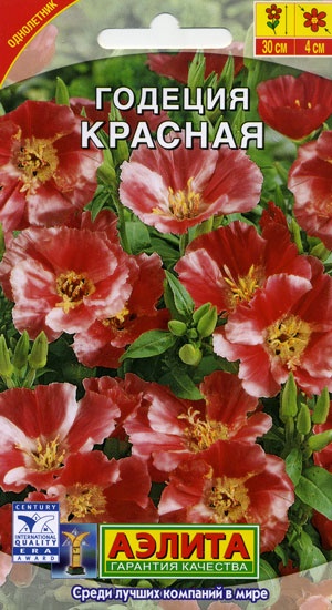Сорт с уникальной яркой, насыщенной окраской крупных цветков, Ø 7-8 см, собранных в плотные, объемные соцветия. Цветки потрясающе декоративны благодаря нежным лепесткам с атласным блеском. Растения компактные, прямостоячие, высотой 40-45 см, хорошо кустятся и обильно цветут. Годеция рекомендуется для оформления разнообразных смешанных садовых клумб, бордюров и контейнеров. Срезанные соцветия долго сохраняют декоративность и свежесть в небольших букетах.