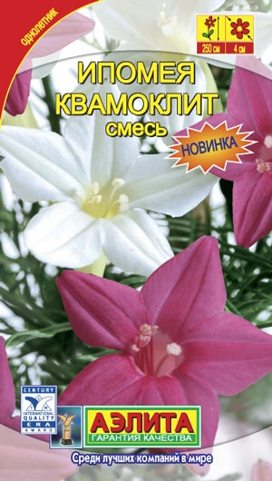 Очень эффектное и необычное вьющееся растение с изящными цветками и ажурными листьями. Популярно у садоводов и известно также как “кипарисная лиана”. Развивается быстро, взбираясь по любой опоре на высоту до 2 м, зацветает рано. Уже с июля оно образует яркий занавес из воздушной зелени и многочисленных цветов-звездочек диаметром 3-5 см. Ипомея станет изысканным украшением участка, террас, беседок, шпалер и арок. Не требует особого ухода.