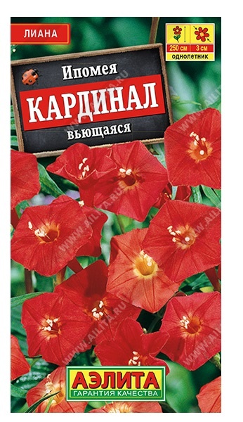 Изящная быстрорастущая однолетняя лиана. Растение способно активно взбираться вверх по любой опоре на высоту более 250 см. Кружевная листва очень декоративна, а в период цветения покрывается ярко-красными мелкими цветками, что делает растение очень эффектным и потрясающе красивым. Ипомея Кардинал вьющаяся используется для вертикального озеленения в саду и на балконах.