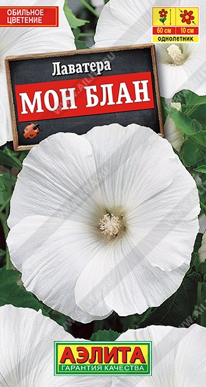 Один из самых эффектных летников. По критерию «неприхотливость и красота цветения» с сортом Мон Блан мало что может сравниться. Куст более густой и более низкий (60 см), чем у большинства лаватер. Крупные белоснежные цветки диаметром 10 см с легким блеском хорошо заметны даже в темноте. Не раскрытые бутоны имеют нежнейший розовый оттенок. Сорт идеально подходит для садов в природном стиле, для живой из городи с целью зонирования участка, для срезки в букеты. Рекомендуется также для оформления крупных садовых контейнеров.