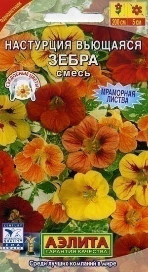 Длинноплетистая настурция с декоративной мраморной листвой. Выглядит привлекательно в течение всего сезона до первых заморозков. Побеги длиной до 200 см. Цветки яркие, диаметром 4-6 см. Выращивается на опорах, по которым необходимо направлять плети, или в ампельной культуре. В цветниках растет как почвопокровное растение, приобретая стелющуюся форму.