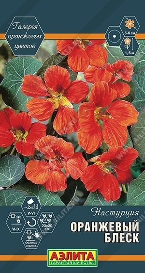 Замечательная вьющаяся неприхотливая настурция. Ее изящные побеги, длиной до 150 см, покрыты множеством ярких цветков, диаметром 5-6 см, которые располагаются над листвой. Листья очень красивые – плотные и блестящие. Сорт прекрасно подойдет для вертикального озеленения, для этого растению необходима опора. Отлично выглядит в подвесных кашпо и клумбах, как почвопокровное растение (расстояние между растениями 1-1,5 м).