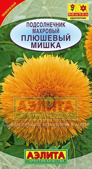 Низкорослый сорт декоративного подсолнечника. Один из самых известных и любимых у цветоводов. Зацветает быстро, особого ухода не требует. Растения компактные, мощные, высотой 50-80 см. На каждом кусте за сезон формируется несколько густомахровых соцветий диаметром 15-20 см. Отличный вари ант для небольшой клумбы, маленького сада. Будет уместен также в смешанном цветнике, поскольку он прекрасно «ладит» со многими подходящими по размеру однолетниками. Хорошо удается в контейнерной культуре, поэтому представляет интерес для декорирования балкона, патио, террасы. ПЛЮШЕВЫЙ МИШКА нравится детишкам. Используется на срезку для составления букетов и композиций.
