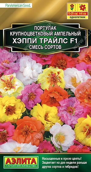 Ампельная смесь портулака с очень яркими цветками от компании PanAmerican Seed (США). Кустики, высотой 15-25 см, отлично растут в ширину – побеги достигают длины 40-45 см. Цветки махровые и полумахровые, диаметром 4-6 см. Растению достаточно 10 часов светового дня для хорошего развития и цветения! Портулак Хэппи Трайлс F1 зацветает на 2 недели раньше других сортов и гибридов портулака. Украсит подвесные кашпо и вазоны. В клумбах и цветниках это почвопокровное растение отлично разрастается и выглядит, как пёстрый ковёр.