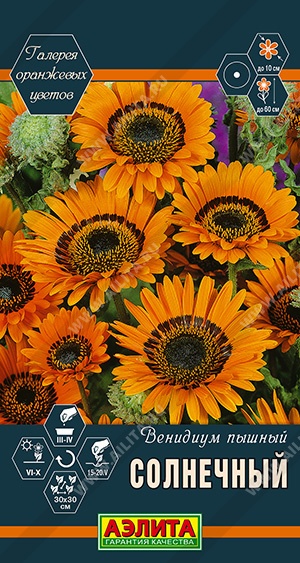 Порция хорошего настроения с оранжевыми цветами! В настоящее время модно создавать цветники, где присутствуют эффектные цветы одной окраски, например, ярко-оранжевые. Они наполняют клумбы праздничной атмосферой и создают контрастные композиции с другими растениями. Считается, если вам нравится оранжевый цвет, вас обязательно ждет успех! Экзотическая африканская красавица! Венидиум – это однолетнее травянистое растение, высотой до 60 см. Кустики широкие, ветвистые, с длинными цветоносами и крупными соцветиями до 10 см в диаметре. Цветы ярко-оранжевые, у основания коричневые в виде небольшого диска. Венидиум цветет обильно с конца июня по октябрь. Прекрасно подойдет для цветников, групповых посадок, каменистых горок и для срезки в букеты!