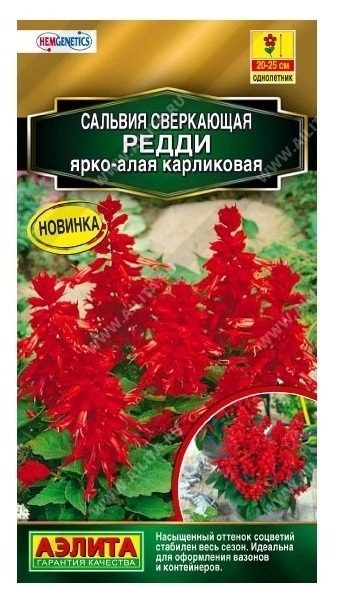 Будто пламя в ночи – огненный цветочный «маяк» – это новый сорт карликовой сальвии Редди голландской селекции! Отличается ранним и равномерным цветением. Соцветия крупные и плотные. Ярко-алые цветки обильно покрывают центральный побег, а изумрудные листья сосредоточены в его нижней трети. Растения карликовые – высотой 20-25 см. Сорт Редди подойдет для составления смешанных цветочных вазонов в саду и контейнеров на балконе. Плотные, групповые посадки сальвии оживят и украсят цветники различных типов.