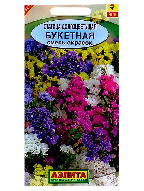 Популярный однолетник из группы сухоцветов. Известен также как лимониум (кермек) выемчатый. Смесь формирует кустики средней высоты – 70-80 см. Из прикорневой розетки листьев выходят крепкие крылатые цветоносы с соцветиями-щитками. Растения отлично украшают миксбордеры, клумбы, альпийские горки. Яркие цветочки привлекают массу бабочек. Для зимних букетов соцветия срезают в полном роспуске и сушат в темных проветриваемых помещениях. Цветение в средней полосе в самый разгар прерывается морозами. Сезон цветения можно продлить, если выращивать статицу в просторных кашпо.
