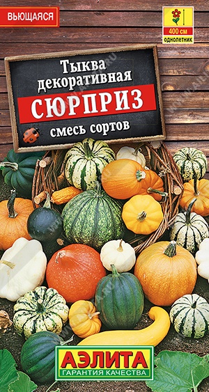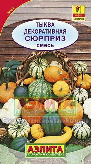 Смесь декоративных тыкв с разнообразной формой плодов. Растения длинноплетистые – главный побег достигает 4 м длины. Плоды массой 200-300 г украсят растения в августе-сентябре. Зрелые плоды собирают до наступления заморозков. Они хорошо хранятся в комнатных условиях и служат оригинальным украшением интерьера. Лианы используются для быстрого вертикального озеленения стен, высоких заборов, беседок, веранд.