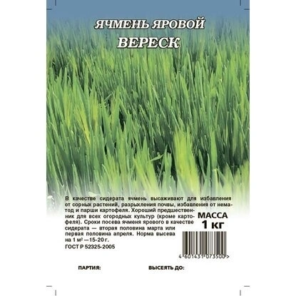 В качестве сидерата ячмень высаживают для избавления от сорных растений, разрыхления почвы, избавления от нематод и парши картофеля. Хороший предшественник для всех огородных культур (кроме картофеля). Сроки посева ячменя ярового в качестве сидерата — вторая половина марта или первая половина апреля. Норма высева на 1 м²—15-20 г.