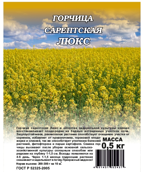 Горчица сарептская Люкс в качестве сидеральной культуры хорошо восстанавливает плодородие на бедных истощенных участках почв. Засухоустойчивое, раннеспелое растение способствует очищению участка от сорняков, избавляет от проволочника, гороховой плодожорки и слизней, так же способствует угнетению болезней растений, фитофтороза и парши картофеля. Семена горчицы высевают после уборки основной сельскохозяйственной культуры сплошным способом или рядками на глубину 1-1,5 см. Всходы появляются на 4-5 день. Через 1-1,5 месяца подросшие растения скашивают и заделывают в почву. Норма высева: 200-300 г на 10 м2. Прекрасный медонос!