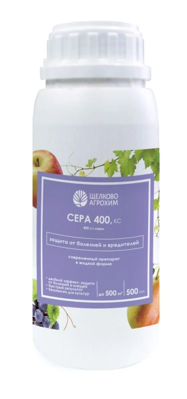 «Сера 400, КС» – препарат двойного назначения для защиты садов и виноградников от болезней и вредителей. Сера обеспечивает защитный барьер, который препятствует прорастанию спор и проникновению грибной инфекции в растительные ткани. Фунгицидное действие препарата обусловлено продуктами восстановления или окисления серы. Пары серы проникают в клетки грибов, растворяются в веществах клетки и образуют сероводород, который токсичен для патогенов. Дополнительное свойство препарата – оно защищает от паутинного клеща. На солнце сера переходит в газообразное состояние, образуя серные пары, которые убивают клещей и их личинок.