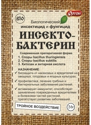 Биологическая защита от насекомых-вредителей. Профилактика, лечение грибковых и бактериальных заболеваний растений. В состав препарата «Инсектобактерин» входит янтарная кислота и хитозан - эффективные стимуляторы роста растений, которые активизируют иммунитет, способствуют заживлению поврежденных вредителями и болезнями частей растений, препятствуют развитию заболеваний.