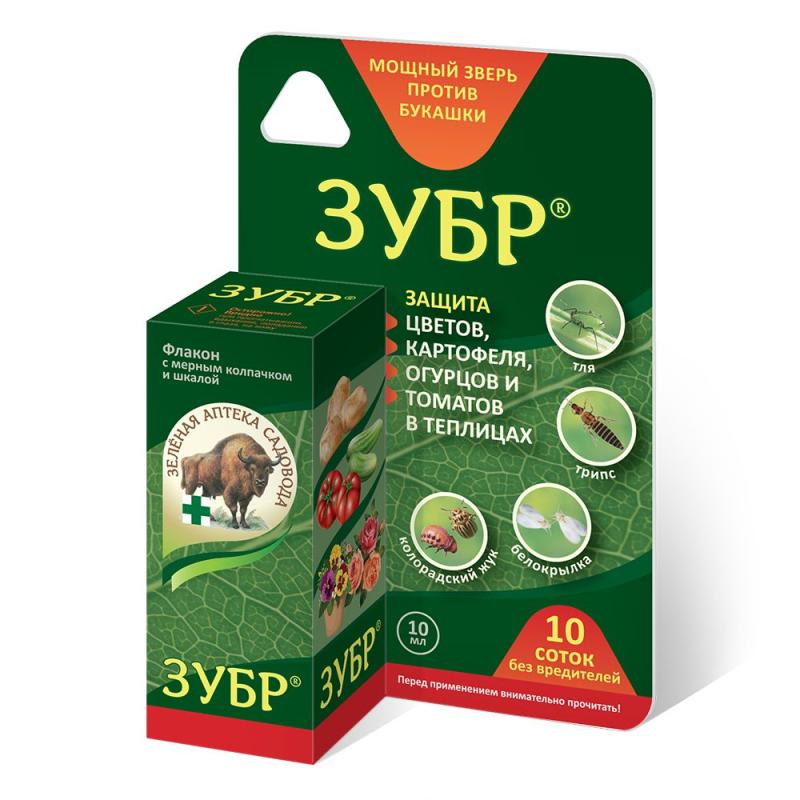 Зубр – инсектицид системного действия, применяется против колорадского жука, тли и белокрылки на картофеле, томатах, огурцах и цветочных культурах. Очень эффективен против колорадского жука, т. к. устойчивости к нему у вредителей нет. Максимальный эффект достигается в 1-2 сутки после применения и сохраняется до 4 недель.