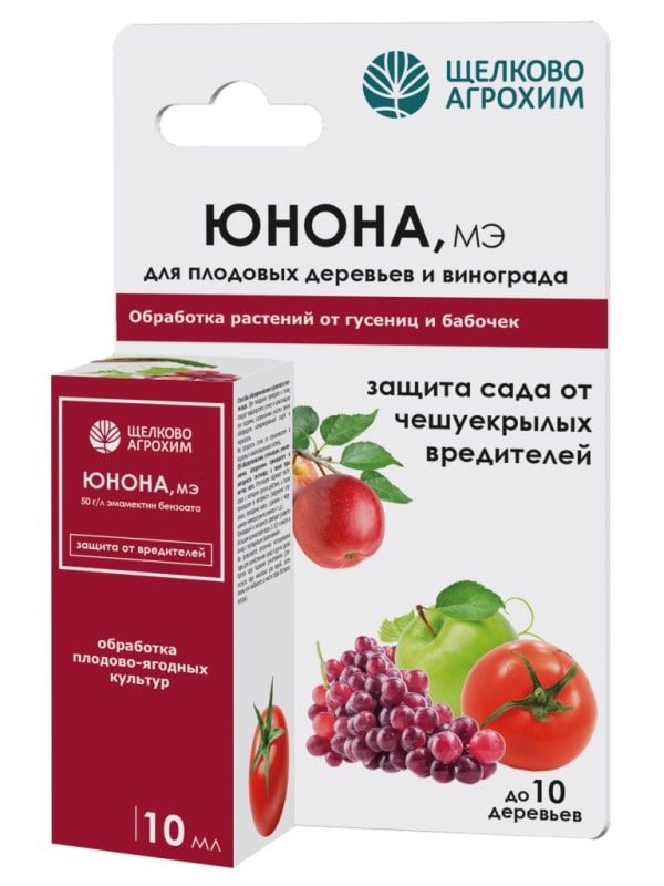 «Юнона, МЭ» – биопрепарат на основе компонентов растительного происхождения – защищает сады и виноградники от чешуекрылых вредителей. Уникальная особенность инсектицида – уничтожение вредителей на разных стадиях развития. После обработки через 1-4 часа гусеницы перестают питаться, и в течение 1-4 суток погибают. Гибель в фазе яйца обеспечена благодаря свойству препарата проникать сквозь оболочку яйца. «Юнона, МЭ» обеспечивает защиту растений от повреждений на 14 дней. При этом препарат, демонстрируя высокую избирательность и действуя только против чешуекрылых вредителей, безопасен для пчел.