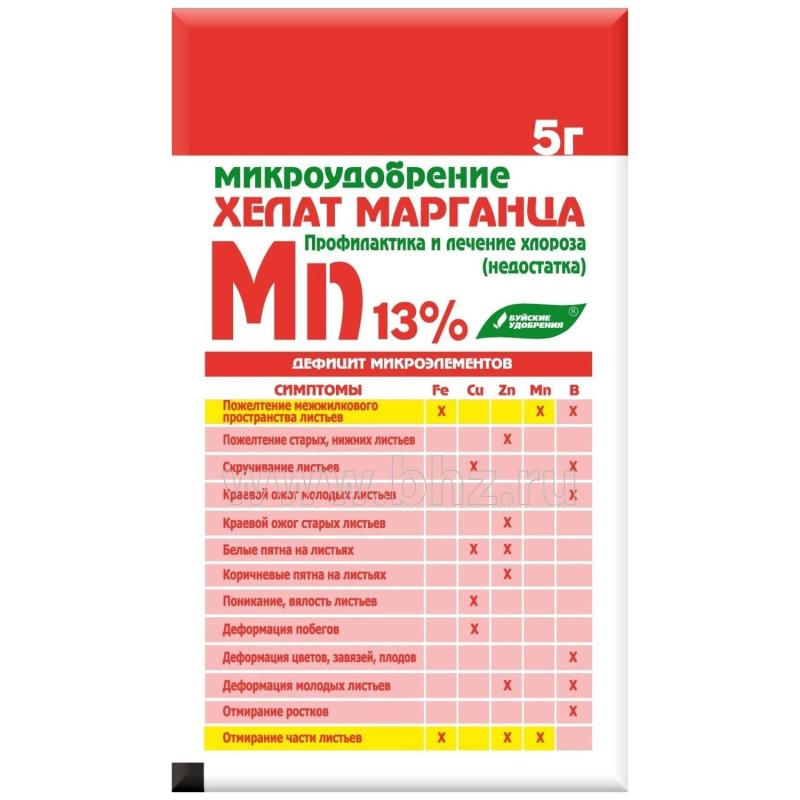 Комплексное органическое соединение, которое активирует действие различных ферментов, входит в их состав, обеспечивает окислительно-восстановительные процессы, фотосинтез, дыхание растений, снижает транспирацию, повышает способность растительных тканей удерживать воду, ускоряет общее развитие растений, положительно влияет на их плодоношение. Подкормки хелатом марганца помогают предотвратить или устранить хлороз (марганцевую недостаточность) для всех видов растений Высокоэффективен в широком диапазоне pH (рН 3 – 10), устойчив к воздействию внешних факторов, может использоваться в различных системах фертигации (полива), гидропонике, совместим с большинством водорастворимых удобрений и средствами защиты растений.