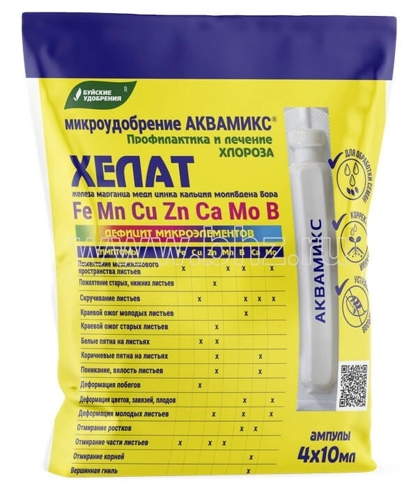 "Аквамикс" – это комплекс микроэлементов в хелатной форме, который борется с проявлением хлорозов (недостатка железа, магния, цинка, меди) у растений, повышает урожайность овощных и плодово-ягодных культур, улучшает качество выращенной продукции. Наличие хелата кальция в составе удобрения позволяет предупреждать и лечит вершинную гниль.